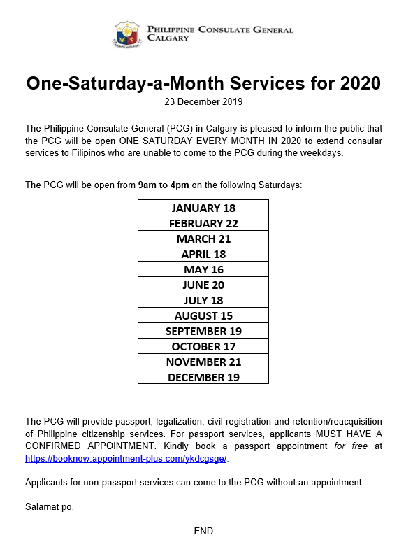 The Philippine Consulate General in Calgary (Calgary PCG) is open one Saturday a month to extend services to Filipinos who are unable to come to the PCG during the weekdays.